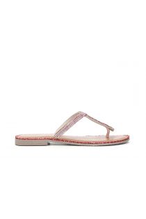 Chanclas con micropedrería decolorada y un enhebrado especial de rafia en contraste a lo largo del perímetro de la plantilla de piel.