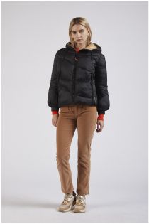 Plumífero de nailon ultrasuave con colores de contraste entre el tejido principal y el forro. la verdadera particularidad está en el interior donde además de llevar impreso nuestro lema "be noir" hay una práctica correa que en los días calurosos permite llevar la prenda como si fuera una mochila. disponible en 4 versiones de color.