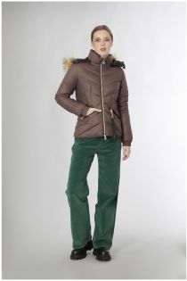 Plumífero corto con línea entallada y capucha rematada con un ribete de piel sintética desmontable.
