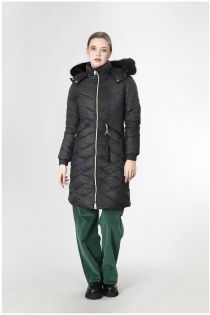 Plumífero de línea entallado con capucha y ribete de piel sintética desmontable.