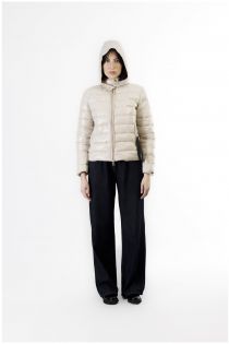 Plumífero corto de forma esencial confeccionado en nailon ultraligero con acabado brillante. la prenda cuenta con una capucha de emergencia oculta en el interior del cuello. versátil y práctico una prenda imprescindible en el armario de la nueva temporada otoño invierno.