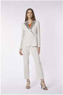 Chaqueta de doble botonadura en tejido fluido. un tejido de lentejuelas en la solapa enriquece y embellece la prenda haciéndola perfecta para una velada especial.