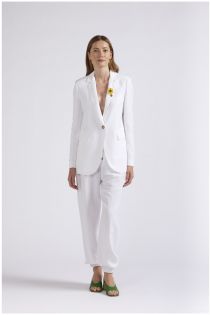 Chaqueta de botonadura simple confeccionada en un fresco tejido de mezcla de lino. la chaqueta está adornada con un delicado accesorio de flores de croché de quita y pon. cierre con botones y bolsillos ribeteados con solapa.