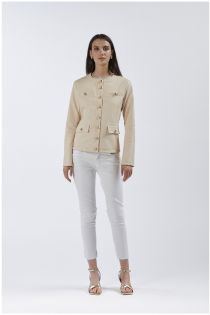 Chaqueta muy femenina de piel sintética con cuello redondo. bolsillos y cierre con botones dorados personalizados.