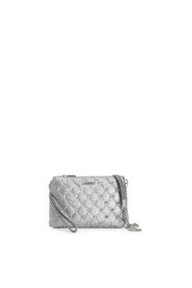 Bolso de mano de glitter con tachuelas hexagonales. bandolera de cadena y asa de muñeca extraíble. compartimento único y bolsillo interior con cremallera. cierre de cremallera.