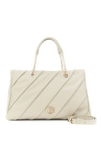 Bolso de compras de piel sintética con pliegues frontales, bolsillo trasero con cremallera y separador interior. Asas acolchadas con cadena metálica con el logo de Café Noir y bandolera extraíble.