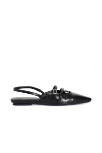 Modelo destalonado en piel con tiras con múltiples hebillas en la parte delantera. cordón elástico en la espalda. forma delgada con tacón de 1.5 cm. moderno cómodo y aportando un toque moderno a tu look este zapato es imprescindible para la temporada.