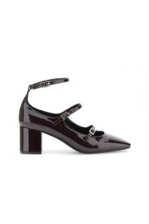 Glamorosos zapatos de salón de charol con tres tiras y hebillas doradas. Plantilla de cuero para mayor comodidad. Tacón cuadrado de 5,8 cm para una elegancia de inspiración retro.