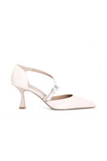 Escote de ante con cruce asimétrico. la plantilla es de piel. zapato ajustado. el tacón es de 7 cm.