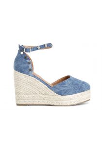 Sandalias de lona sobre cuña de cuerda de 10.5 cm y plataforma de 3.5 cm. correa en el tobillo. plantilla de piel. zapato cerrado por delante y por detrás. tachuelas doradas en la parte superior y en la correa.