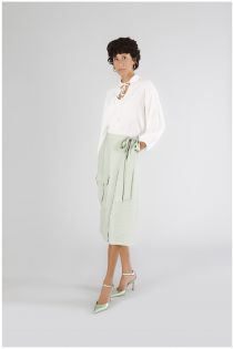 Falda tipo cartera por debajo de la rodilla con maxibolsillo lateral en tejido fluido y fluido. un toque de feminidad y alegría a tu guardarropa gracias al detalle del lazo lateral. modelo perfecto para quienes quieren expresar creatividad y originalidad en cada ocasión.