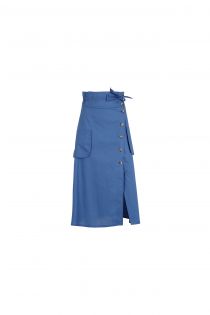 Falda de algodón con botonadura delante y fajín de tejido. Bolsillos especiales de parche aplicados.