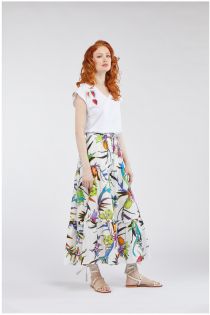 Falda larga de estilo gipsy con volantes fruncidos y cintura elástica. Disponible en tres variantes de estampados exclusivos.