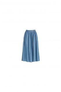 Falda larga de tencel efecto vaquero. La prenda presenta contrastes de tejido estampado y un elástico en la parte posterior del cinturón para facilitar el ajuste.