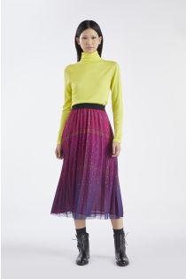 Falda plisada confeccionada en un vivo tejido fil coupé estampado que emana puntos de luz iridiscentes.