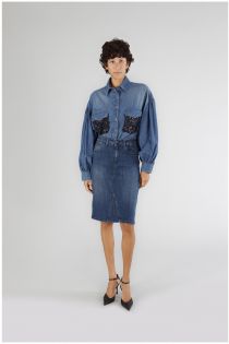 Falda midi vaquera confeccionada en lona superstretch y abertura en la parte trasera de la falda. prenda adecuada para ocasiones informales con camiseta y zapatos planos.