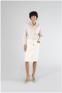 Falda midi confeccionada en tejido bull denim elástico. cierre con botones visibles y abertura en la parte trasera de la falda. prenda adecuada para ocasiones informales con camiseta y zapatos planos.