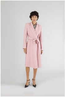 Gabardina larga con cinturón en tejido fluido y caído con bolsillos de parche.