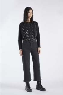 Pantalones de tela denim superstretch con vestibilidad culotte y aplicación particular de pedrería a juego que crea una raya diplomática