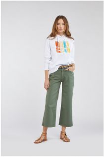 Vaqueros culotte Greta realizados de bull denim adornados con cinta étnica multicolor. El modelo Greta es audaz en su simplicidad. Como tú.