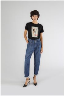 Jeans mom fit con pliegues delanteros confeccionados en lona denim holgada. prenda perfecta para aquellas que se sienten independientes y a la moda y a las que les encanta experimentar y estar siempre chic y originales.