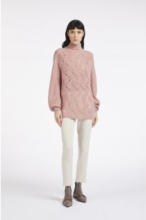 Elegante jersey de cuello alto con detalle calado y mangas amplias realizado en hilado de mezcla de angora.