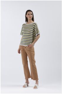 Jersey multicolor con escote de barco y manga corta. jersey de hilo de mezcla de algodón con elaboración de croché. prenda básica perfecta para un look de los años 70. combínalo con unos vaqueros flare o una maxifalda.