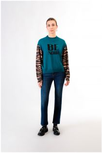 Jersey cropped con cuello biker confeccionado en hilo de mezcla de lana cálido y suave. confección en punto jersey y jacquard para nuestro eslogan "be noir" adornado con pedrería aplicada por expertos. disponible en variante bicolor con mangas estampadas.