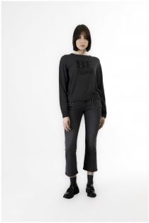Jersey en hilo de mezcla de lana cálido y suave. confección en punto jersey y jacquard para nuestro eslogan "be noir" adornado con pedrería aplicada por expertos. disponible en una variante bicolor muy moderna y en dos variantes de color liso.