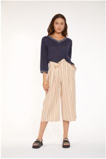 Jersey en hilado de viscosa de corte holgado con detalles de lúrex en los puños y el escote. El escote amplio y de pico será el protagonista e ilumina el modelo.