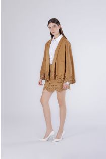 Chaqueta kimono de antelina con elegantes mangas y dobladillo cortados a láser. líneas fluidas y diseño refinado ideal para looks contemporáneos. perfecta para combinar con atuendos casuales o más sofisticados. la modelo mide 171 cm y lleva una talla s. corte cómodo.