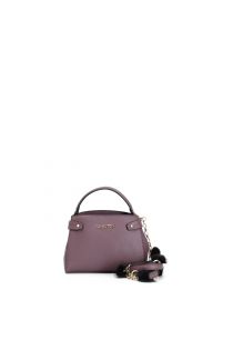 Minibolso de material con efecto envejecido y cierres metálicos. bolsa para llevar en la mano o con bandolera opcional con pompón.