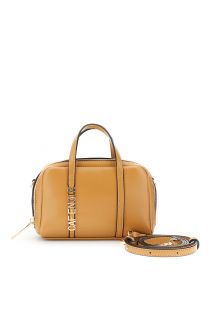 Minibolso de piel sintética lisa con letras metálicas de gran tamaño. Correa de hombro ajustable y extraíble para llevarlo en la mano o cruzado. Diseño compacto y moderno.