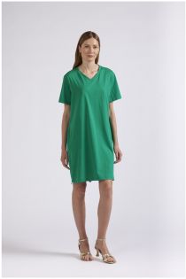 Minivestido bimateria con parte delantera de punto de algodón y parte trasera de sangallo. escote de pico y manga corta. vestibilidad cómoda.