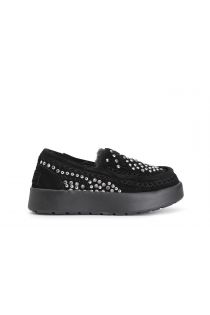 Mocasín de mujer con plataforma. exterior de piel de ante y forro de pelo sintético. el zapato está adornado con pedrería tachuelas y aplicaciones.