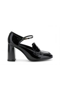 Mocasín de mujer en charol con correa y hebilla personalizada. tacón cuadrado de 88 mm. la plantilla es de piel. zapato muy versátil y chic para interpretar con estilo looks de oficina y de ocio.