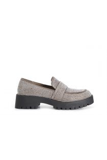 Mocasín de mujer en microfibra. parte superior recubierta de micropedrería. suela dentada de goma y tacón de 40 mm.