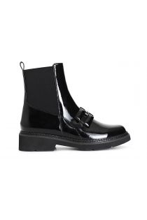 Botín de mujer en polipiel efecto charol. bandas elásticas en el lateral de la pala para facilitar el ajuste. enriquecido con una abrazadera en el bucle. la plantilla es de piel.