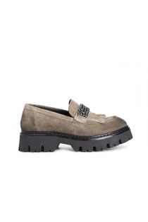 mocasín de mujer con flecos y complemento de ante. nut