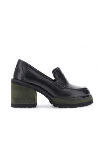 Mocasines de piel negra con tacón de 9 cm. Forro y plantilla de piel para una comodidad superior. Estilo atrevido y versátil para looks urbanos y chic.