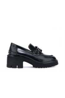 Mocasines de piel cepillada con una gran cadena brillante. Suela de plataforma de 2,5 cm y tacón de 5,5 cm. Forro y plantilla de piel. Elegancia audaz para looks atrevidos y contemporáneos.