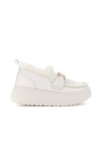 Mocasines de piel blanca con detalles dorados. Forro y plantilla de piel sintética. Cómodos y cálidos, con plataforma de 4 cm. Perfectos para looks elegantes de invierno.