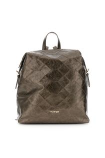 Mochila de suave piel sintética metalizada con bordado geométrico en la parte delantera, correas de hombro ajustables, bolsillo trasero plano y hebillas cuadradas. Elegantes letras metálicas.