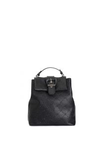 Mochila con solapa con estampado de monogramas cierre de hebilla cubierta asa superior bolsillo trasero con cremallera y letras de metal para un estilo sofisticado.