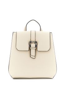 Mochila de piel sintética con solapa, detalles acanalados en contraste y hebilla joya en la parte delantera. Elegante y práctica, perfecta para looks urbanos y chic.