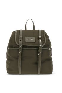 Mochila de nailon con solapa y bolsillo frontal, con correas ajustables con hebillas y ojales. Un logotipo metálico con letras le da un toque urbano distintivo.