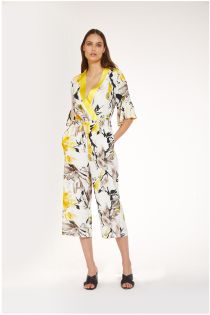 Mono marocain de viscosa estampada con pronunciado escote cruzado. Pantalón recto y amplias mangas de campana.