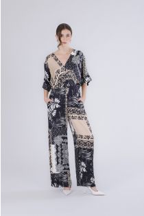 Mono largo de mujer con escote cruzado y cintura elástica confeccionado en satén de viscosa estampado. silueta fluida pernera ancha y estampado elegante para looks refinados de día y de noche. la modelo mide 171 cm y lleva una talla s. corte: regular.
