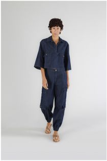 Pantalón estilo cargo con grandes bolsillos y bajo elástico confeccionado en lona denim ligera. modelo con cintura elástica en la espalda. cierre con botón y cremallera oculta. imprescindible en el armario para lucir en el día con su camisa a juego.