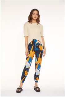 Pantalón cómodo realizado de punto estampado. Los volúmenes en el fondo de la pierna son amplios y están sujetos por un elástico. Amplio elástico en la cintura funcional y decorativo